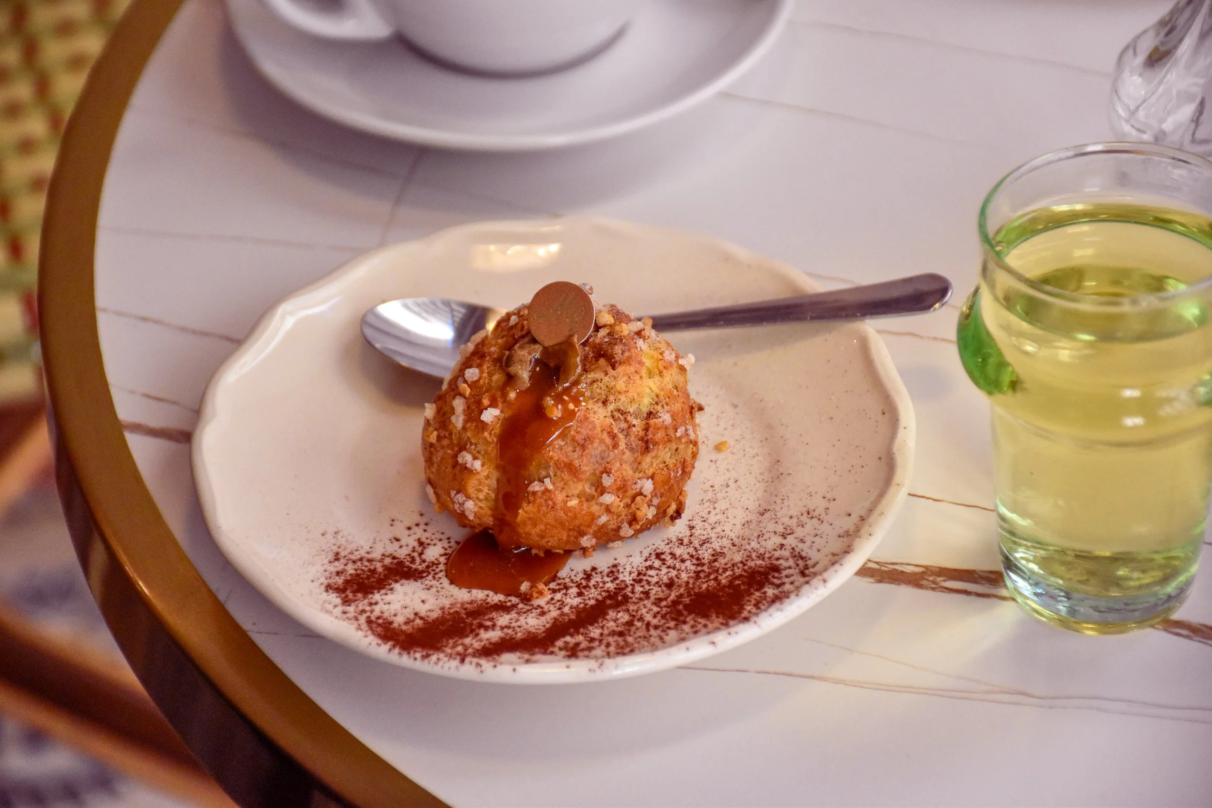 Nos profiteroles sont nappées de sauce chocolat 68% du Ghana, et amandes caramélisées