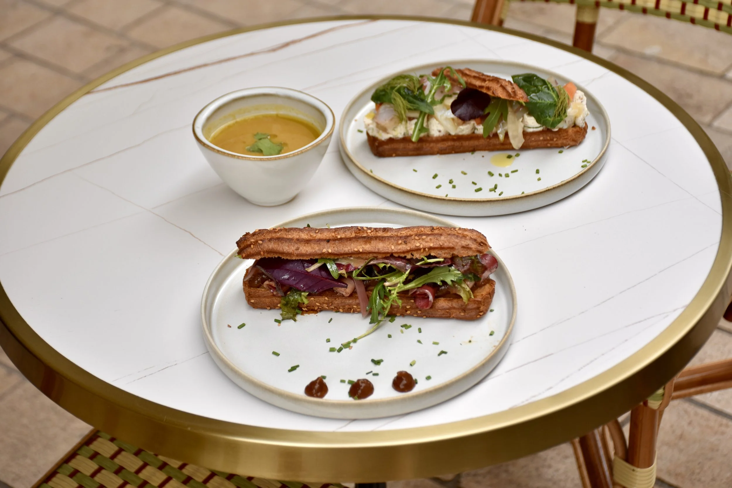 Gravlax de daurade royale, cream cheese acidulé et fines herbes, yuzu, pickles et jeunes pousses. Accompagné d’un velouté citron, courgettes, parmesan servi froid. 17€
